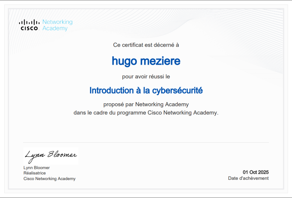 Dans le cadre de mon BTS SIO, j’ai suivi et validé le cours en ligne « Introduction to Cybersecurity » proposé par la Cisco Networking Academy, d’une durée d’environ 6 heures, réalisé en auto‑formation sur la plateforme NetAcad. Cette formation m’a permis d’acquérir les bases de la cybersécurité : types de menaces et d’attaques, vulnérabilités, bonnes pratiques de protection des données et de la vie privée, ainsi que le rôle des organisations pour sécuriser leurs systèmes d’information.